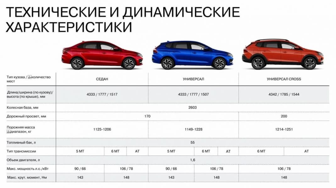 Lada Iskra оснащается двигателями мощностью от 90 до 115 л.с., ниже представлены габаритные размеры и других характеристики новинок в трёх кузовах: