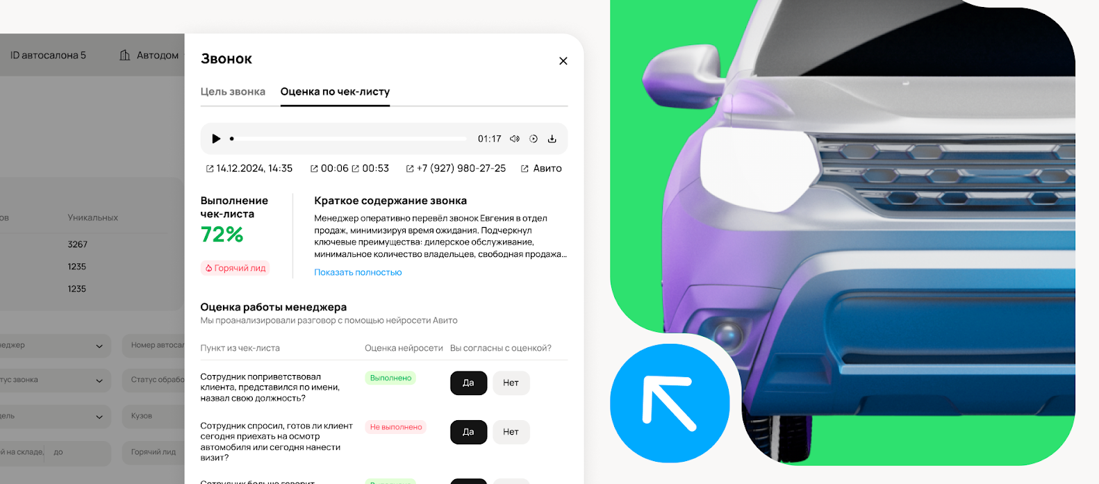 Нейросеть определяет уровень заинтересованности клиентов и подсказывает дилерам, как улучшить качество обслуживания. Нейросеть не только определяет упущенные возможности во время разговора, но и дает конкретные рекомендации по их исправлению, помогая доводить переговоры до успешного завершения и улучшать процессы коммуникаций с клиентами. Тестирование технологии показало рост повторных контактов с клиентами, готовыми к покупке, на 16% и увеличение количества заключённых сделок на 5,6%.