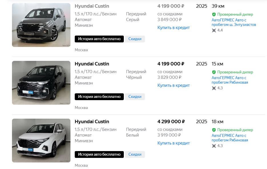 Первые Hyundai Custin 2025 года выпуска появились в России в начале апреля, цена составляла 4,5 млн рублей. А сейчас к крупному дилеру «АвтоГермес» приехала новая партия машин 2025 года выпуска, цены оказались приятнее — 4,2-4,3 млн рублей. Скидки за кредит и trade-in делают машину дешевле на 350-380 тыс. рублей.