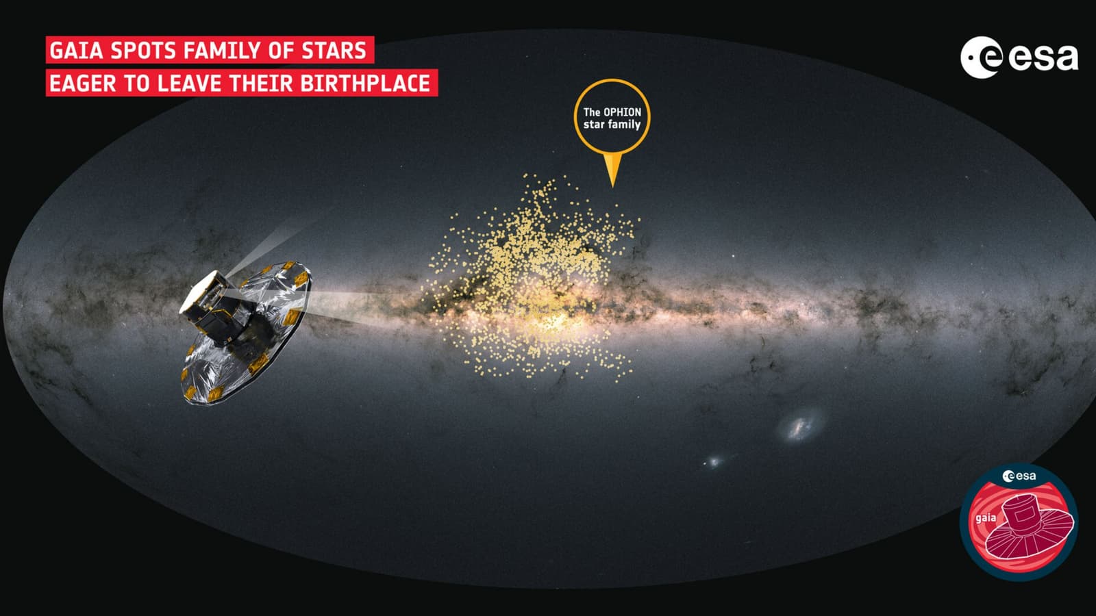 Европейское космическое агентство (ESA) объявило о сенсационном открытии, сделанном с помощью миссии Gaia: впервые в мире обнаружена необычная звездная семья из более чем 1000 молодых звезд, названная Ophion, которая ведет себя совершенно нехарактерно для таких крупных звездных групп. Эти звезды, расположенные примерно в 650 световых годах от Земли, готовы стремительно и хаотично разлететься по Млечному Пути, распавшись в рекордно короткие сроки — всего за несколько миллионов лет. Открытие стало возможным благодаря новому аналитическому моделированию Gaia Net и огромному объему спектроскопических данных Gaia Data Release 3.