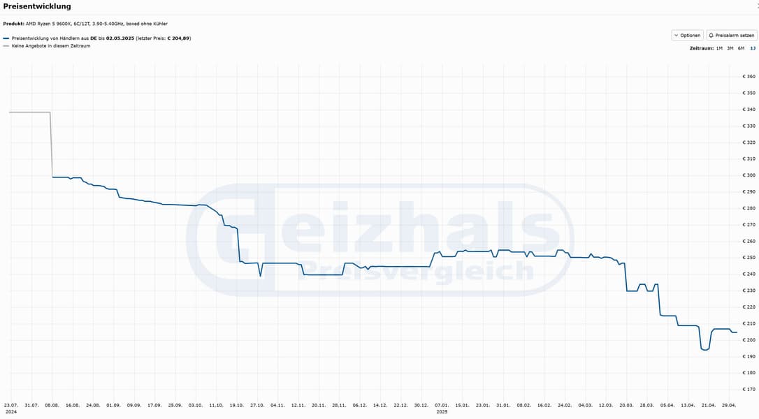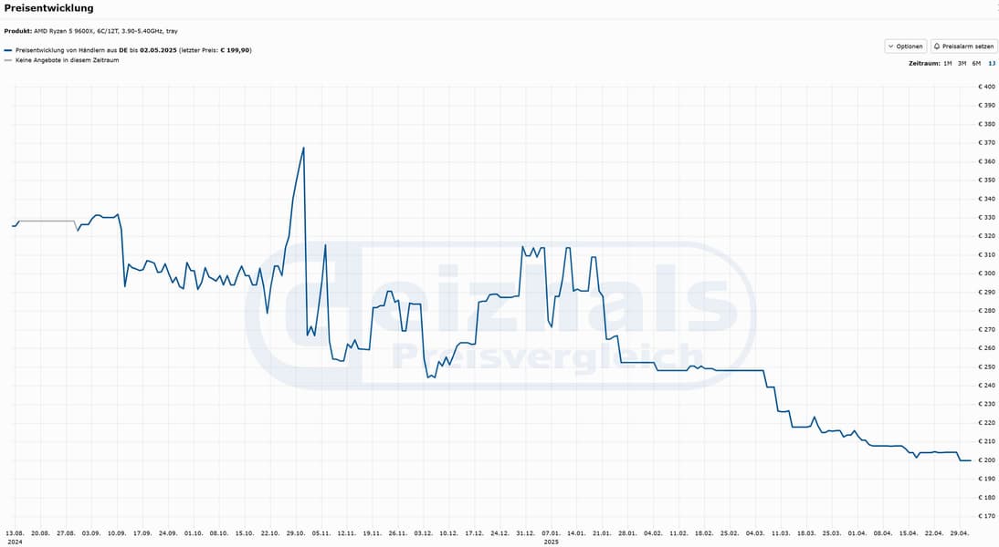 Процессоры AMD Ryzen 9000 на архитектуре Zen 5 продолжают дешеветь, и шестиядерный Ryzen 5 9600X достиг исторического минимума в Европе — в Германии стоимость опустилась до отметки в 200 евро. При запуске процессора в августе 2024 года его цена составляла 300 евро, но за последние месяцы стоимость постепенно снижалась, а в этом году дисконты стали ещё заметнее. По данным сервиса Geizhals, отслеживающего цены на комплектующие в Германии, стоимость Ryzen 5 9600X впервые опустилась до 200. Если точнее, цена коробочной версии — 205 евро, версия без коробки (tray) чуть дешевле.
