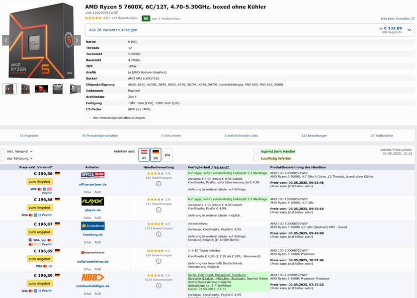 В США на Amazon Ryzen 5 9600X сейчас продаётся за 185 долларов, тогда как его предшественник Ryzen 5 7600X стоит $206. Шестиядерный 9600X, превосходящий 7600X в играх и рабочих задачах, становится особенно привлекательным вариантом для бюджетных и средних игровых систем. Для сравнения, в Германии за коробочный вариант Ryzen 5 7600X просят от 197 долларов. И тут тоже нет никакого смысла покупать «старый» процессор, если доплата за «новый» — меньше 10 евро.