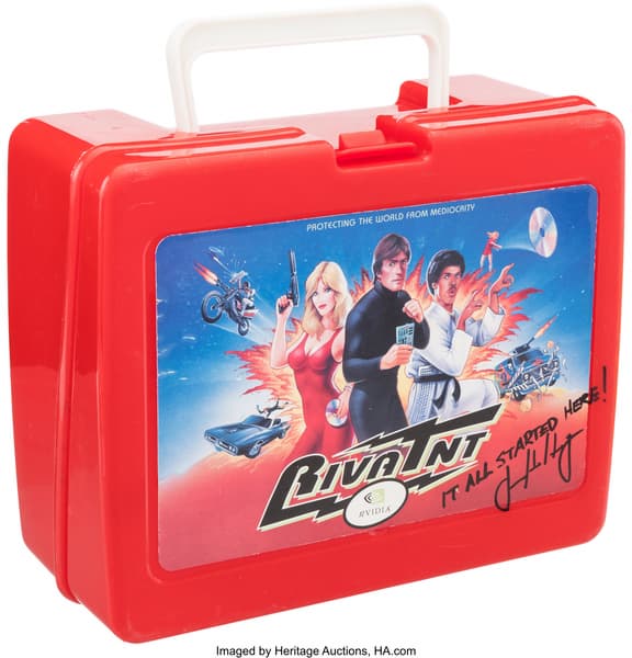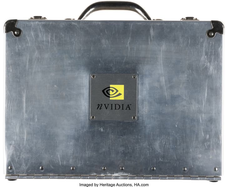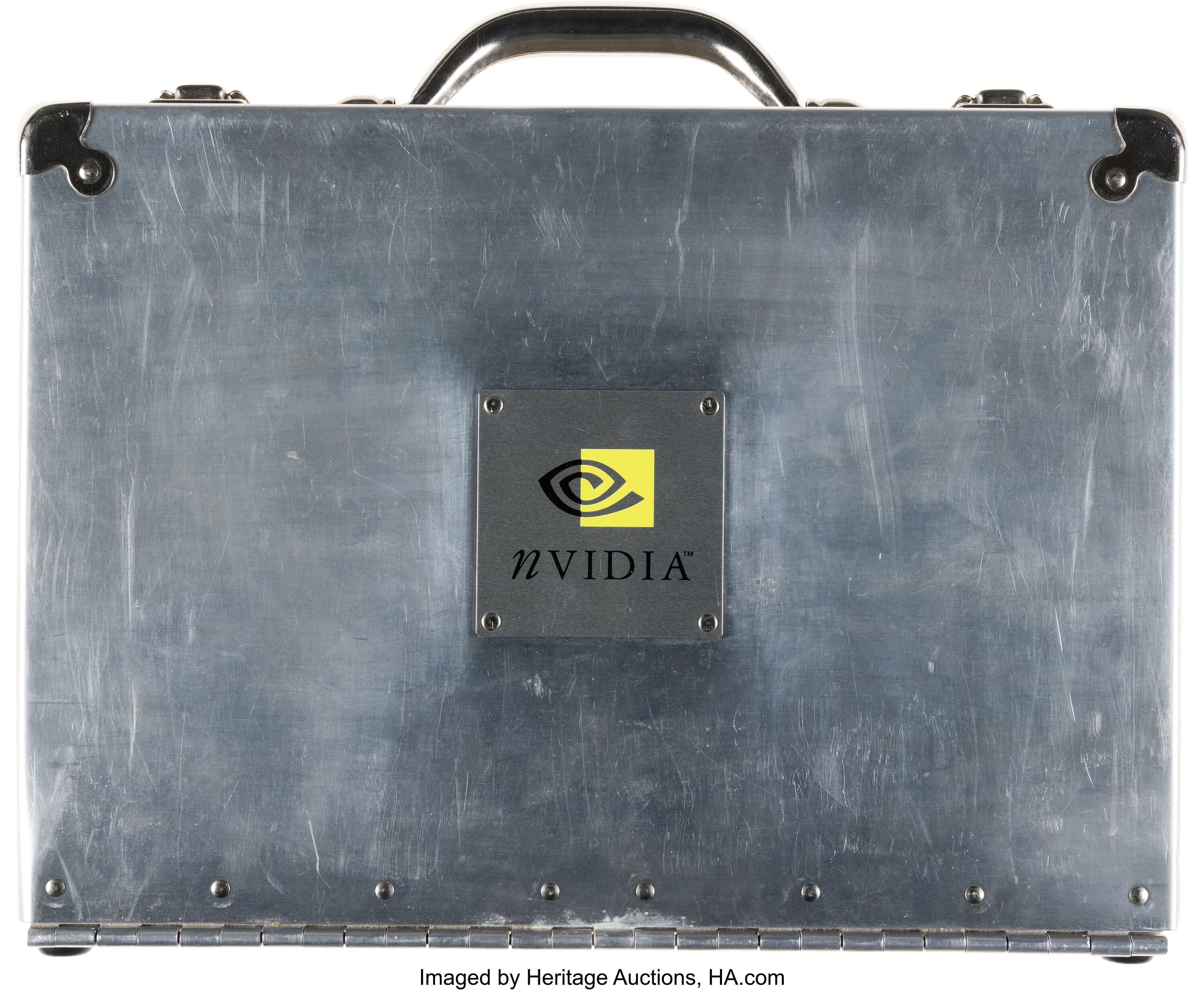 Речь идёт об инженерном прототипе видеокарты Nvidia RIVA TNT, редкости которому добавляют два элемента. Во-первых, это автограф Дженсена Хуанга, а во-вторых, очень редкий ланч-бокс. Это рекламный ланч-бокс 1998 года выпуска. Это очень редкий объект, изначально распространявшийся среди сотрудников и избранных журналистов.