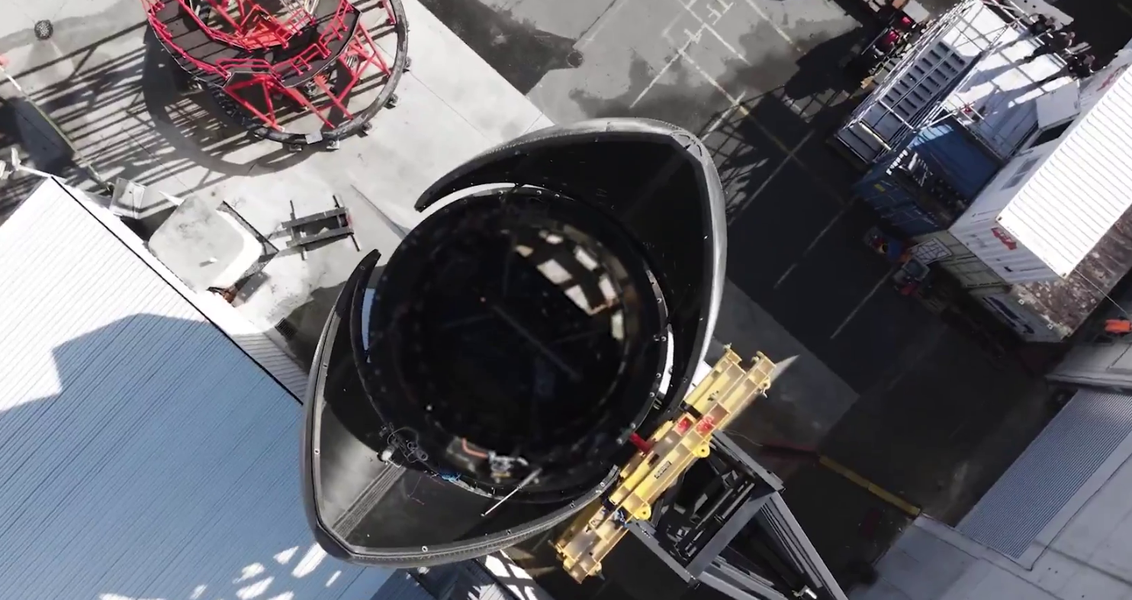 Обтекатель, установленный на фрагмент корпуса первой ступени с аэродинамическими рулями, предназначен для защиты второй ступени ракеты во время старта. Уникальная конструкция обтекателя позволяет раскрывать его створки для выпуска полезной нагрузки, оставаясь частью многоразовой системы.