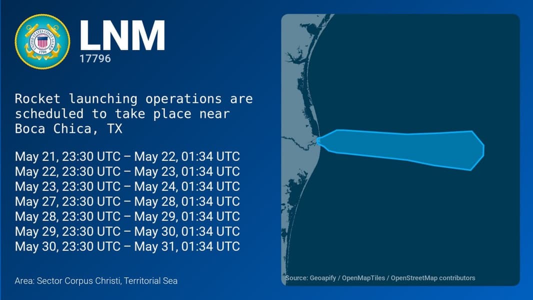 SpaceX активно готовится к девятому испытательному полёту ракеты Starship, он может состояться уже 21 мая 2025 года, согласно уведомлению Береговой охраны США (поздно ночью 22 мая в России). Однако это — всего лишь одна из дат. Как видно на картинке ниже, в уведомлении Береговой охраны США значатся семь дат в период с 21 по 30 мая, время одно и то же.
