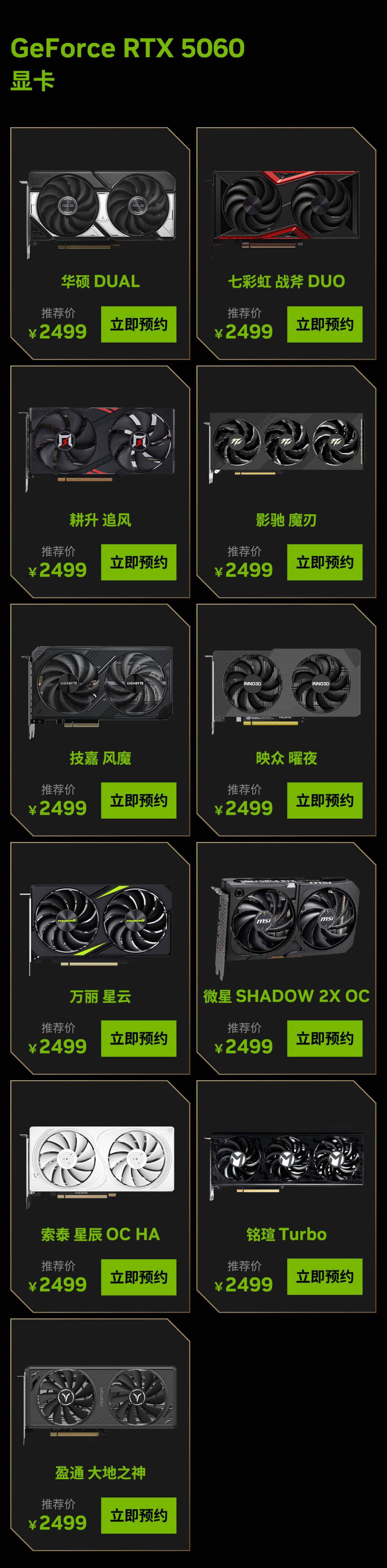 Вчера вечером в Китае начали принимать предварительные заказы на 3D-карту Nvidia GeForce RTX 5060. Новинка предлагается самыми разными производителями — Asus, Colorful, Gigabyte, MSI и т.д., но цена у всех одна — 2500 юаней (350 долларов). Реальные продажи стартуют 20 мая.