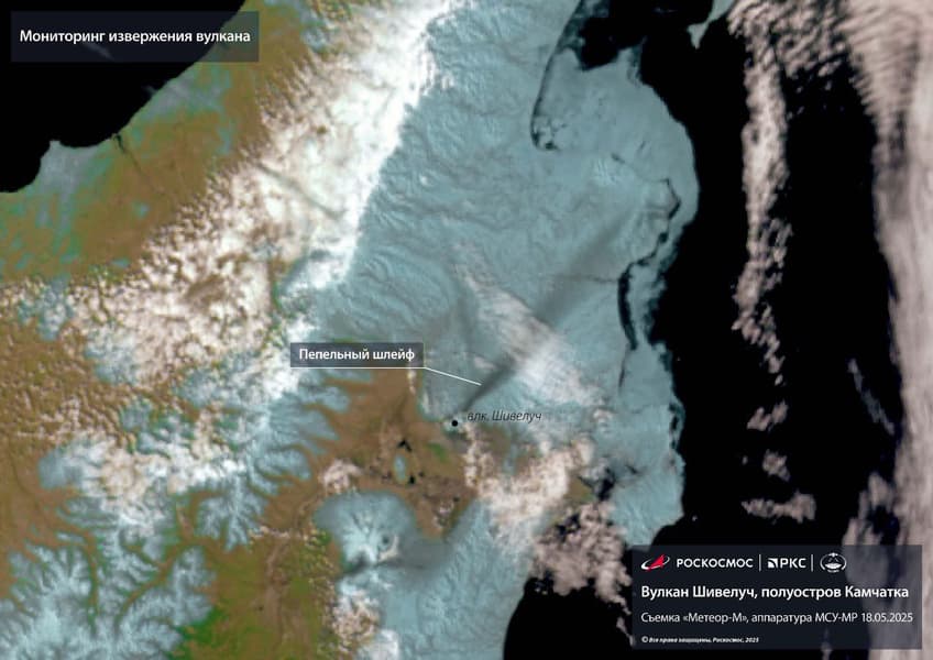 Госкорпорация «Роскосмос» поделилась снимком извержения вулкана Шивелуч в Камчатском крае, сделанным со спутника «Метеор-М» 19 мая 2025 года.