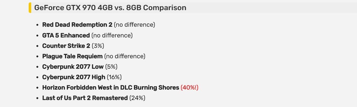 Оказалось, что даже 4 ГБ может быть вполне достаточно. Из восьми игр пять показали либо нулевую реакцию на удвоение памяти, либо мизерную. В одном случае рост составил 16%, во втором это было уже 24%, и в Horizon Forbidden West речь шла уже о 40-процентной разнице.
