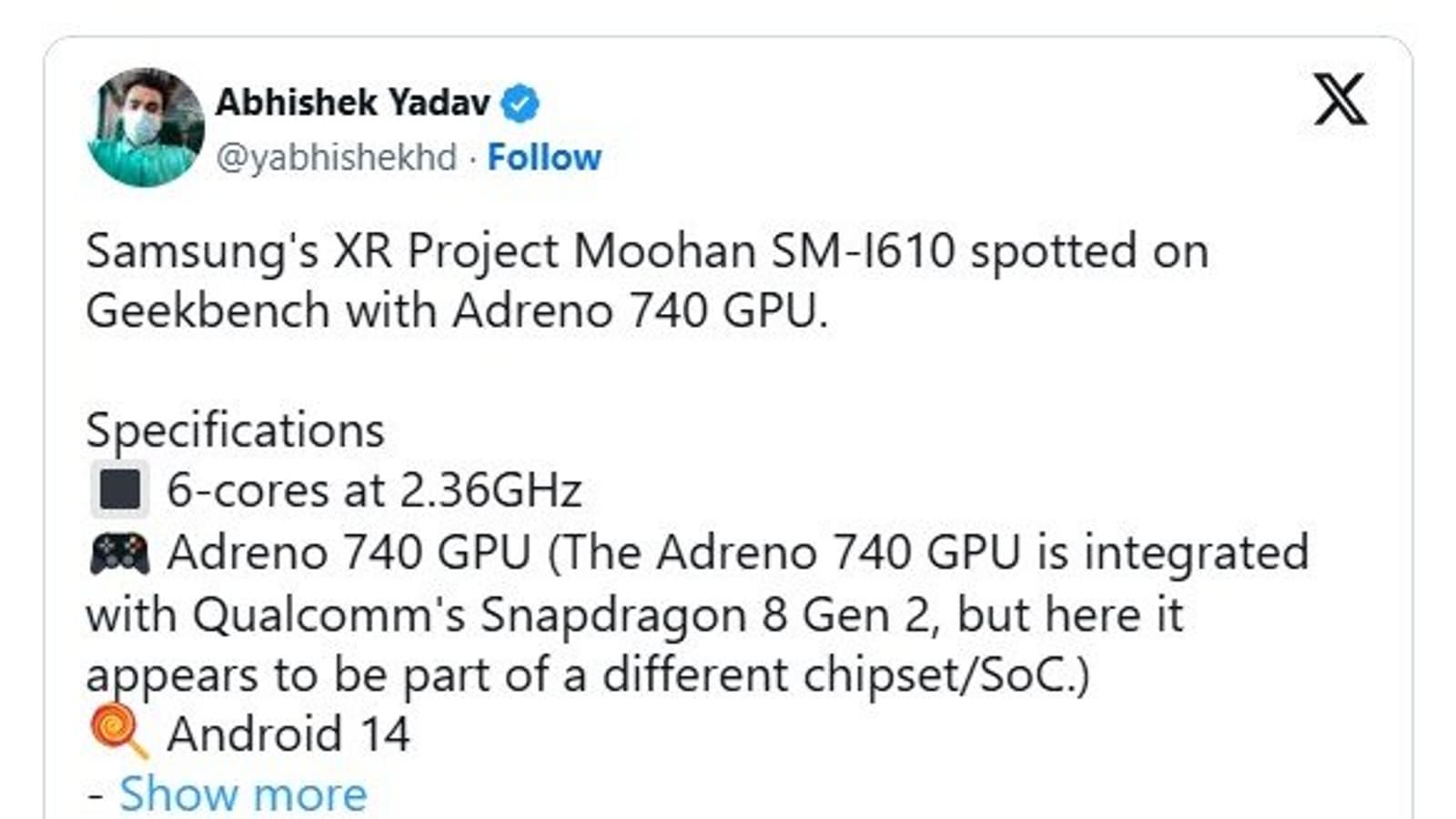 Совместная XR-гарнитура Project Moohan от Google и Samsung получила первые подтверждённые технические детали. Благодаря данным из бенчмарка, обнаруженного инсайдером @yabhishekhd, стало известно, что устройство будет работать на процессоре Snapdragon XR2+ Gen 2 от Qualcomm с 16 ГБ оперативной памяти. ОС Android 14 в нём адаптирована для виртуальной и дополненной реальности.