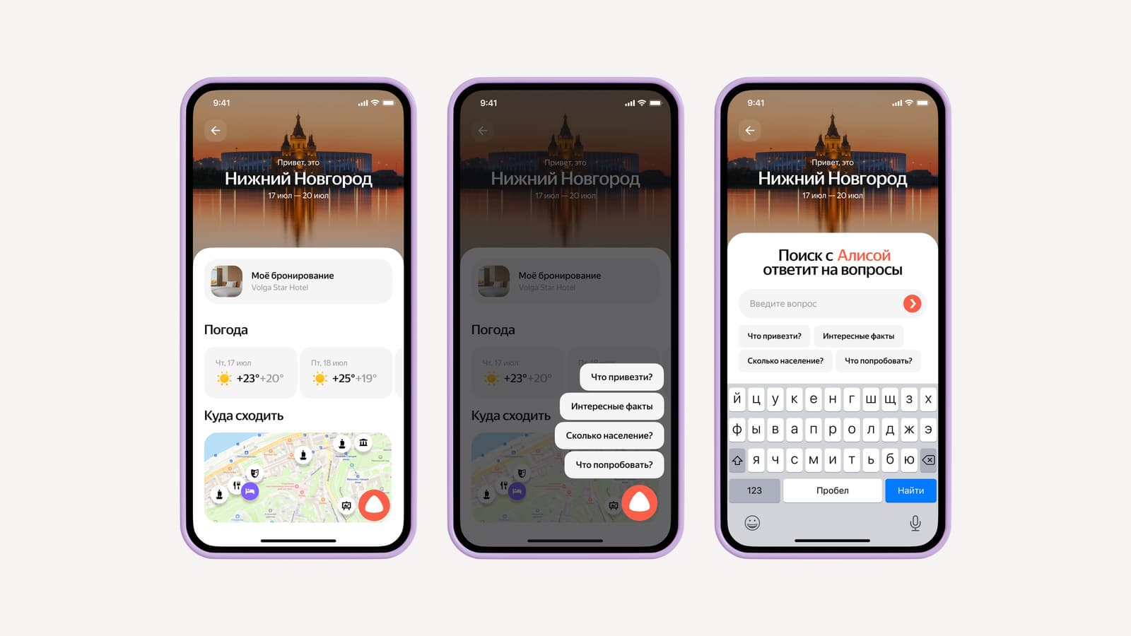 Чтобы обратиться к «Алисе», достаточно нажать на её значок в правом нижнем углу экрана в разделе «Моя поездка». Вопрос можно сформулировать самому или выбрать одну из всплывающих подсказок, например «Интересные факты» или «Что привезти». «Алиса» готова помочь и при планировании путешествия, и уже на месте — она учитывает, где сейчас находится пользователь и какие города он планирует посетить.