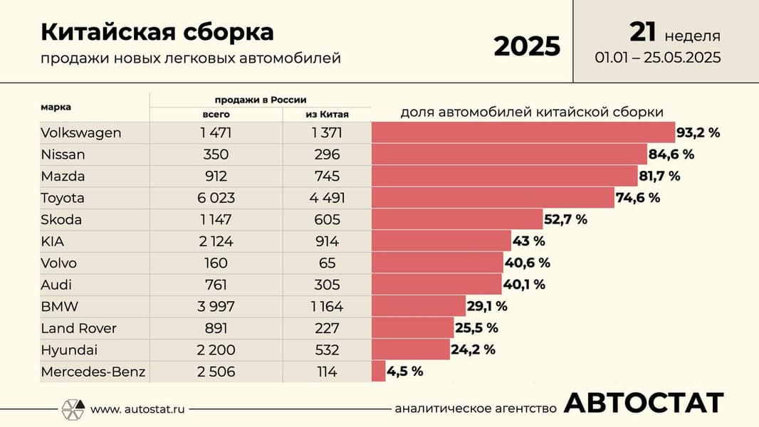 Интересную статистику привел глава «Автостата» Сергей Целиков: он выделил некитайские автомобильные бренды на российском рынке с самой высокой долей машин китайского производства. Получилось, что самым «китайским» из некитайских брендов оказался Volkswagen: из почти 1,5 тыс. машин Volkswagen, проданных в РФ с начала года (по 21 неделю 2025 года включительно) 93,2% произведены в КНР.