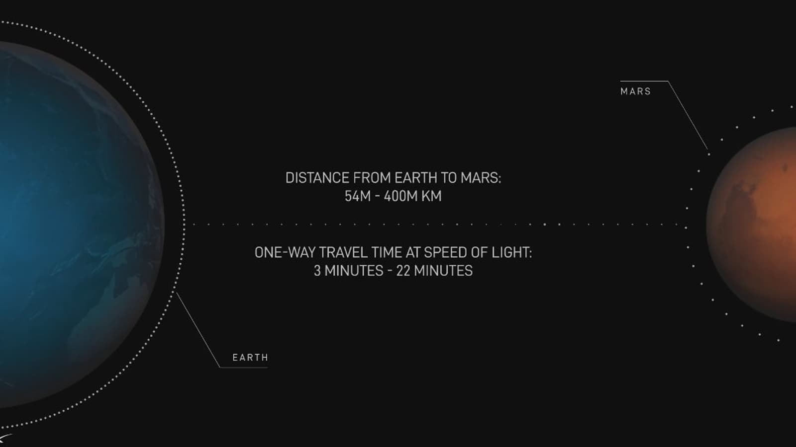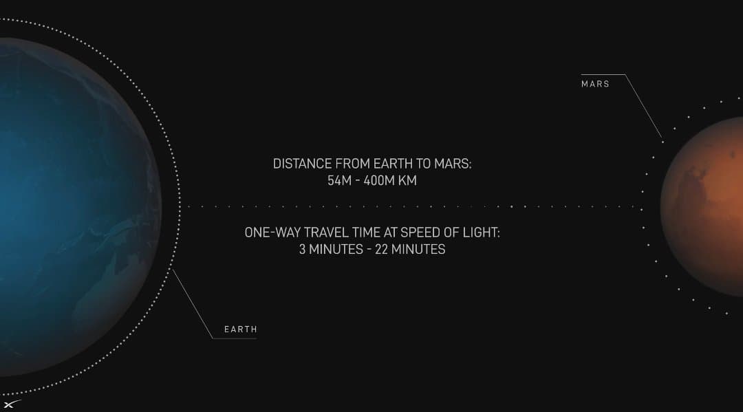 Задержка в передаче данных между Землёй и Марсом составит от 3 до 22 минут в зависимости от расположения планет, что соответствует расстоянию от 54 до 400 млн км.