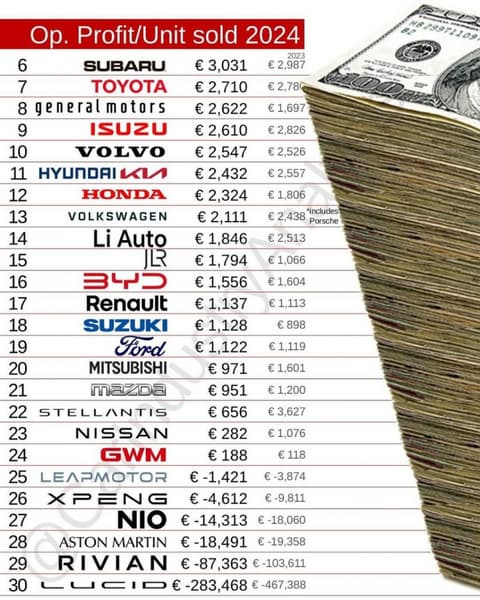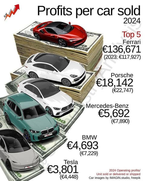 BMW следует за ними с 4,7 тыс. евро на единицу, снизив доходность с 7,2 тыс. евро годом ранее, а Tesla закрывает топ-5 с 3,8 тыс. евро, по сравнению с 4,4 тыс. евро в предыдущем году.