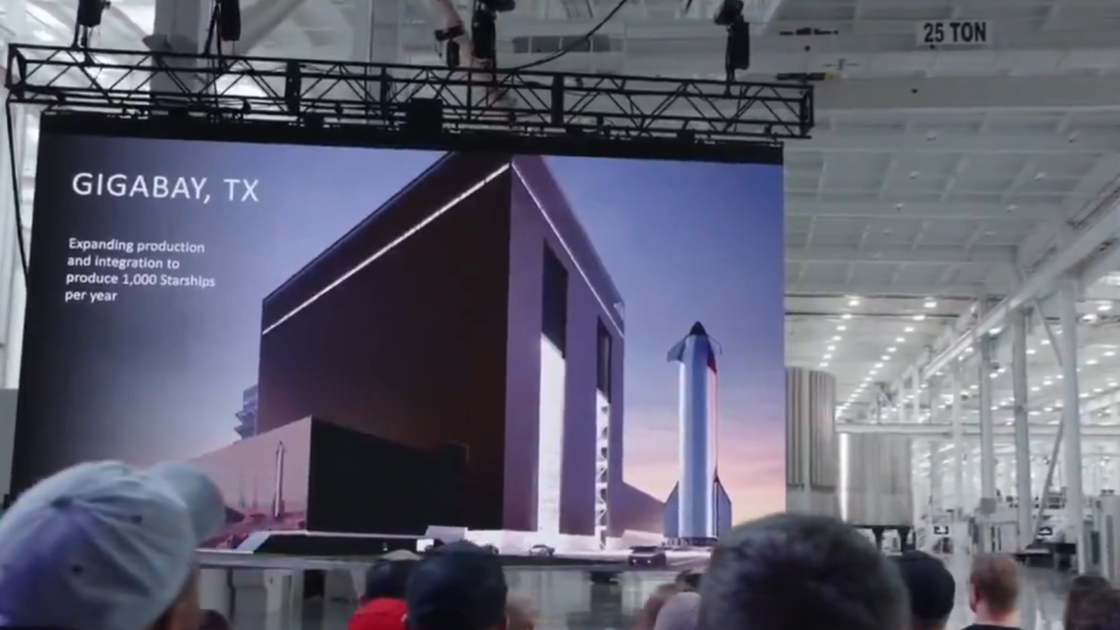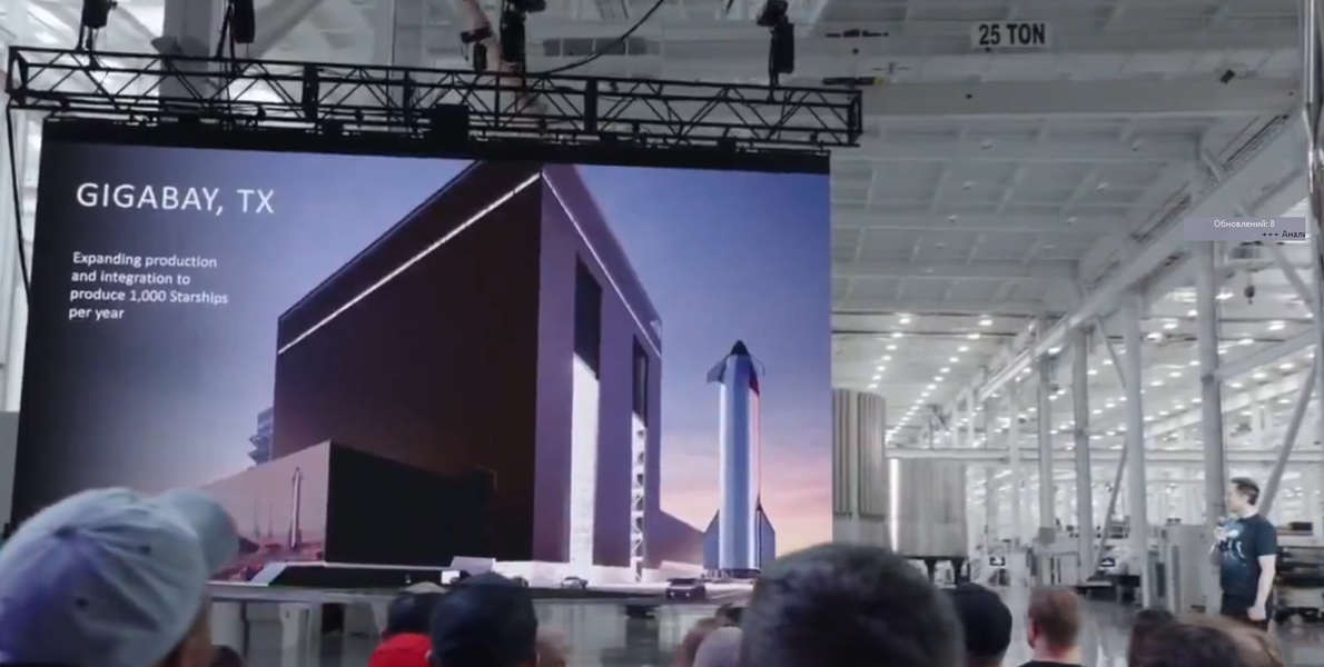 «Это наш Gigabay. Он еще не построен, но мы его строим. Это будет одно из крупнейших сооружений в мире, думаю, по некоторым параметрам, это будет самое большое строение в мире. Оно рассчитано на тысячу Starship в год», — заявил Илон Маск