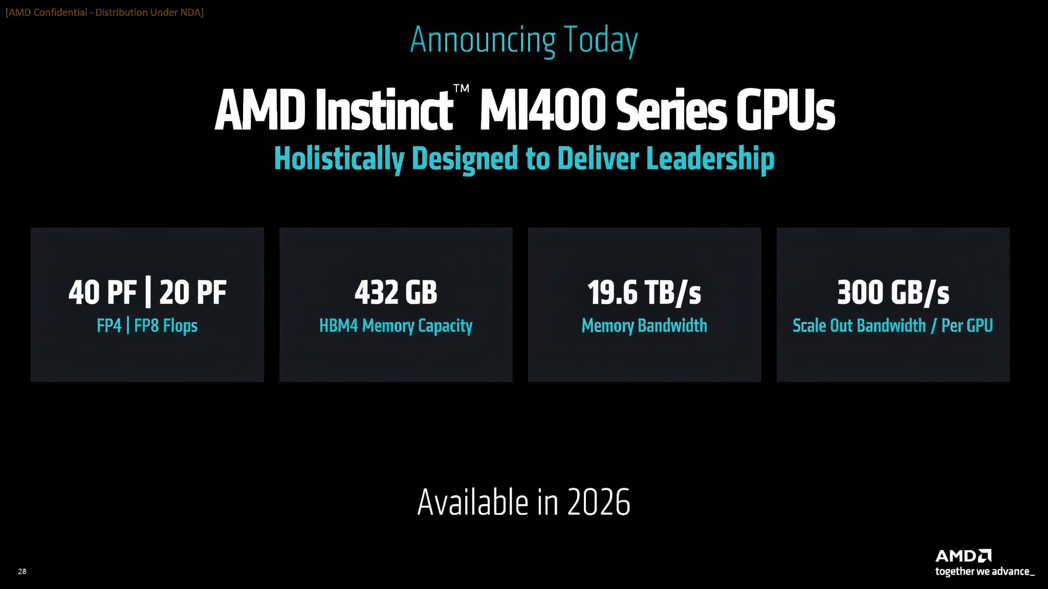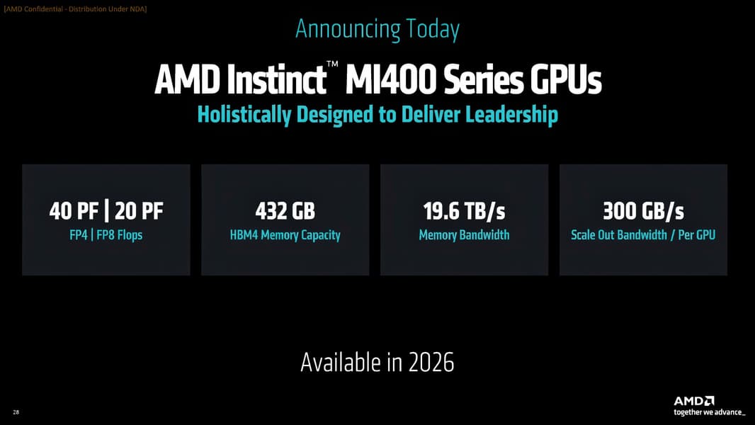 На фоне Instinct MI400 даже новинки кажутся устаревшими и хилыми. Всех параметров, конечно, пока нет, но достаточно сказать, что новый ускоритель получит 432 ГБ памяти HBM4 с пропускной способностью 19,6 ТБ/с!