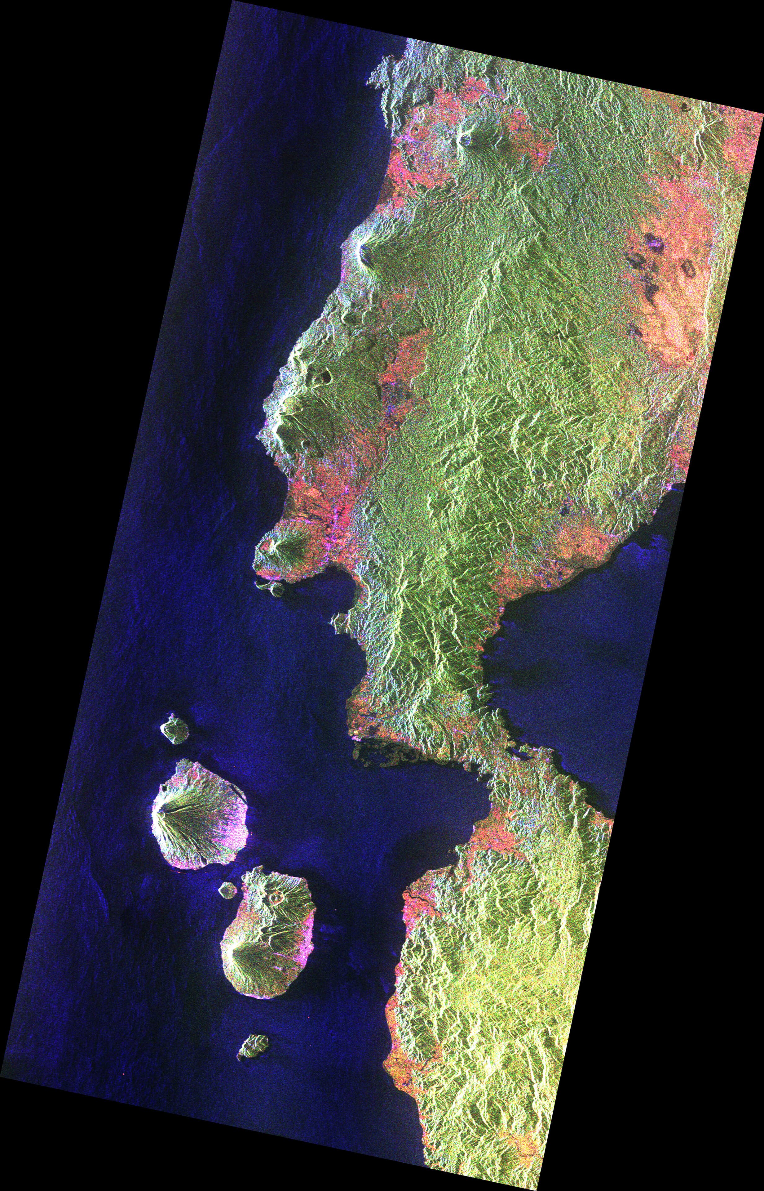 Потом спутник снял острова Индонезии. Это гористый район с тропическим лесом. Видны даже вулканы — в том числе действующий Гамконгора на севере. Тут хорошо заметно, что радар Biomass может не только «видеть» лес, но и рельеф под ним.
