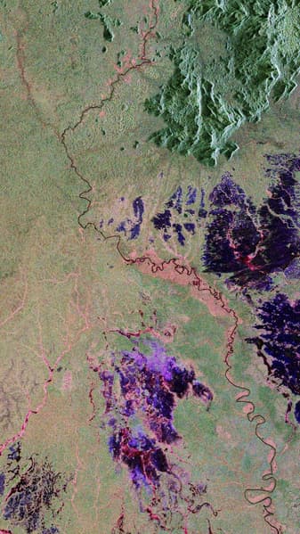 Дальше — снимок из Африки. На нём — река Ивиндо в Габоне. Остальная часть изображения зелёная — это густые леса. Хорошо читаются возвышенности, то есть спутник действительно «пробивает» лесной покров до самого ландшафта.