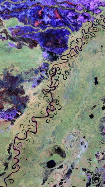 Первый снимок сделан над Боливией. Эта страна — одна из мировых лидеров по вырубке первичных лесов, главная причина тому — расширение сельского хозяйства. Снимок демонстрирует «разноцветную мозаику»: зелёное — тропический лес, красное — затопляемые леса, сине-фиолетовое — луга, чёрное — вода. Хорошо видно, как извивается река Бени — одна из тех, что свободно текут в бассейне Амазонки.