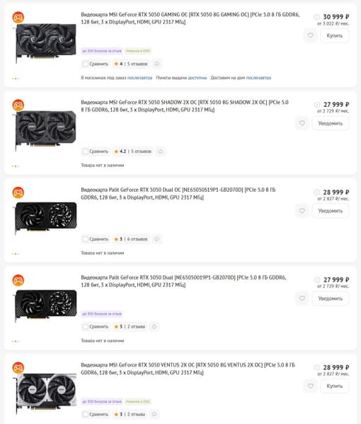 Самая дорогая — MSI GeForce RTX 5050 Gaming OC за 31 тыс. рублей. Все пять моделей оснащены системой охлаждения с двумя вентиляторами.