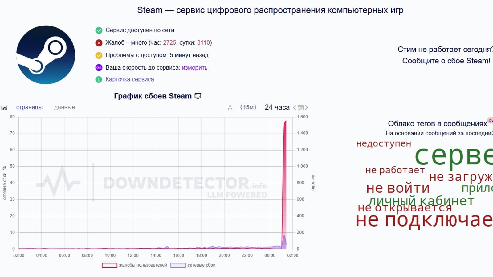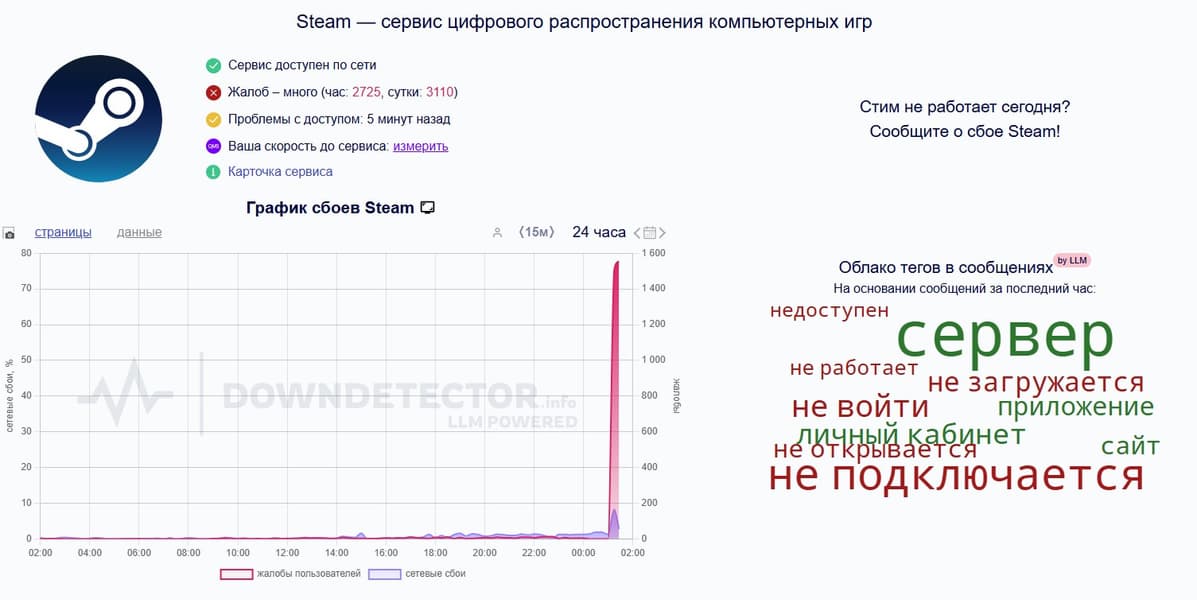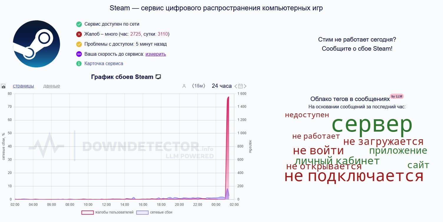 Методология сервиса, фиксирующего сбои, исключает ложные тревоги: инцидент регистрируется только при значительном отклонении от стандартного числа отчётов. На момент публикации новости Valve не прокомментировала причины происшествия.