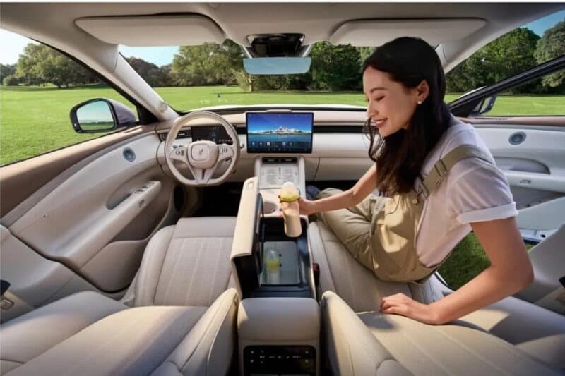 В салоне есть 33 отсека для хранения, холодильник на 7 литров (от -6°C до 50°C), панорамный люк (1,78 м²), 22 динамика и сиденья с вентиляцией, обогревом и регулировкой. Автомобиль поддерживает голосовое управление, OTA-обновления и дистанционное управление через смартфон.