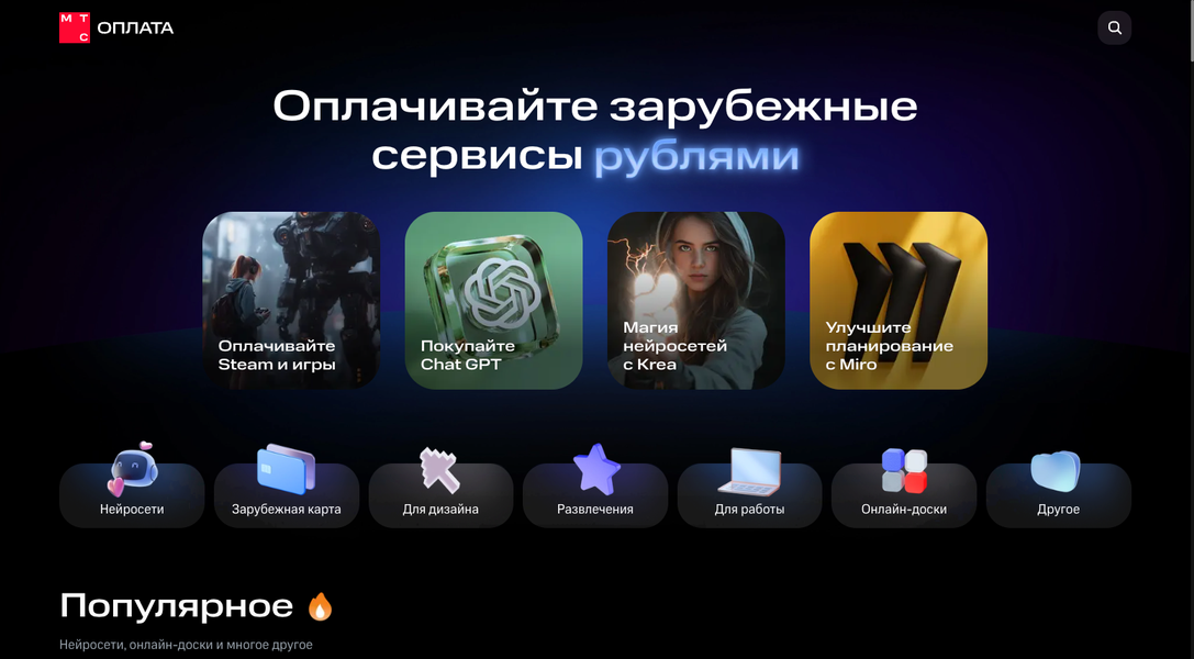 Оператор МТС объявил о расширении охвата сервиса «МТС Оплата». Раньше пользователи могли оплачивать преимущественно иностранные игры и игровые сервисы. Теперь они могут купить или продлить подписку порядка 50 зарубежных сервисов для работы, учебы и бизнеса на отдельном сайте.