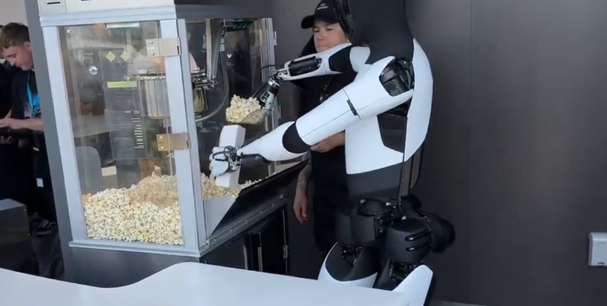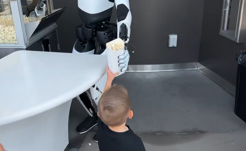 Робот Tesla Optimus демонстрирует свою способность обслуживать посетителей, раздавая попкорн детям в новейшем ресторане быстрого обслуживания Tesla Diner.