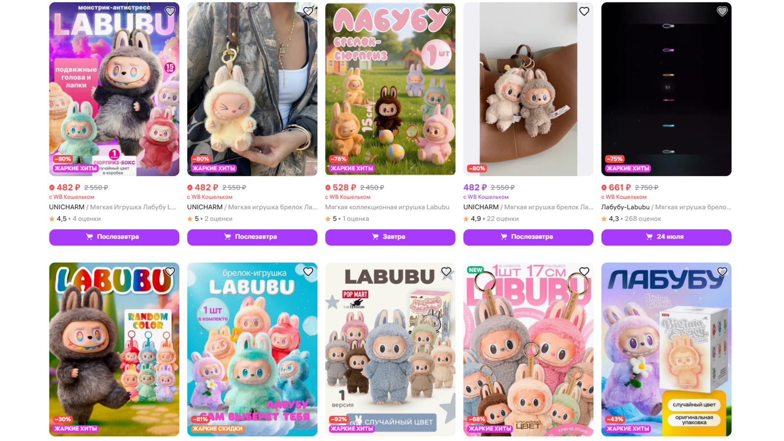 Хотя Лабубу появились на Wildberries еще в июле 2024 года, их популярность резко выросла только весной 2025 года. В мае продажи увеличились на 4700% по сравнению с апрелем, достигнув десятков миллионов рублей.
