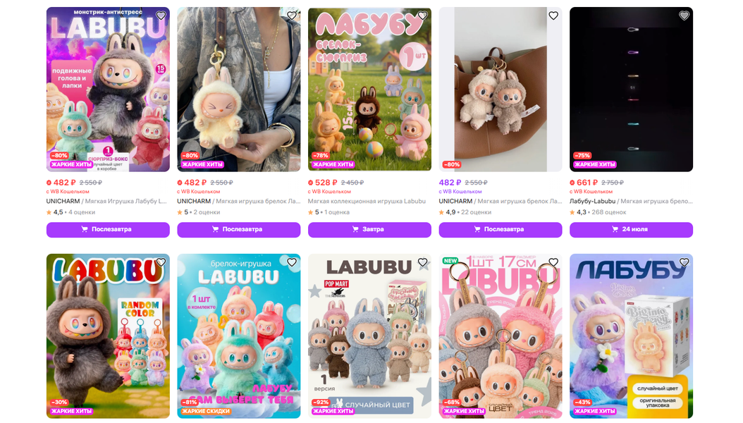 В среднем каждый десятый россиянин приобрел Лабубу на Wildberries, что подчеркивает масштаб ажиотажа. Лабубу привлекают не только детей, но и взрослых, которые как бы возвращаются в детство и коллекционируют игрушки