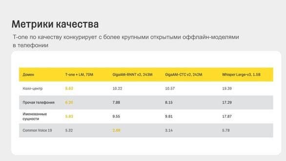 Кроме того, T-one достаточно компактна, чтобы запускать эту модель без необходимости закупать дорогостоящее оборудование. T-one распространяется по лицензии Apache 2.0, разрешающей свободное коммерческое использование и модификацию.