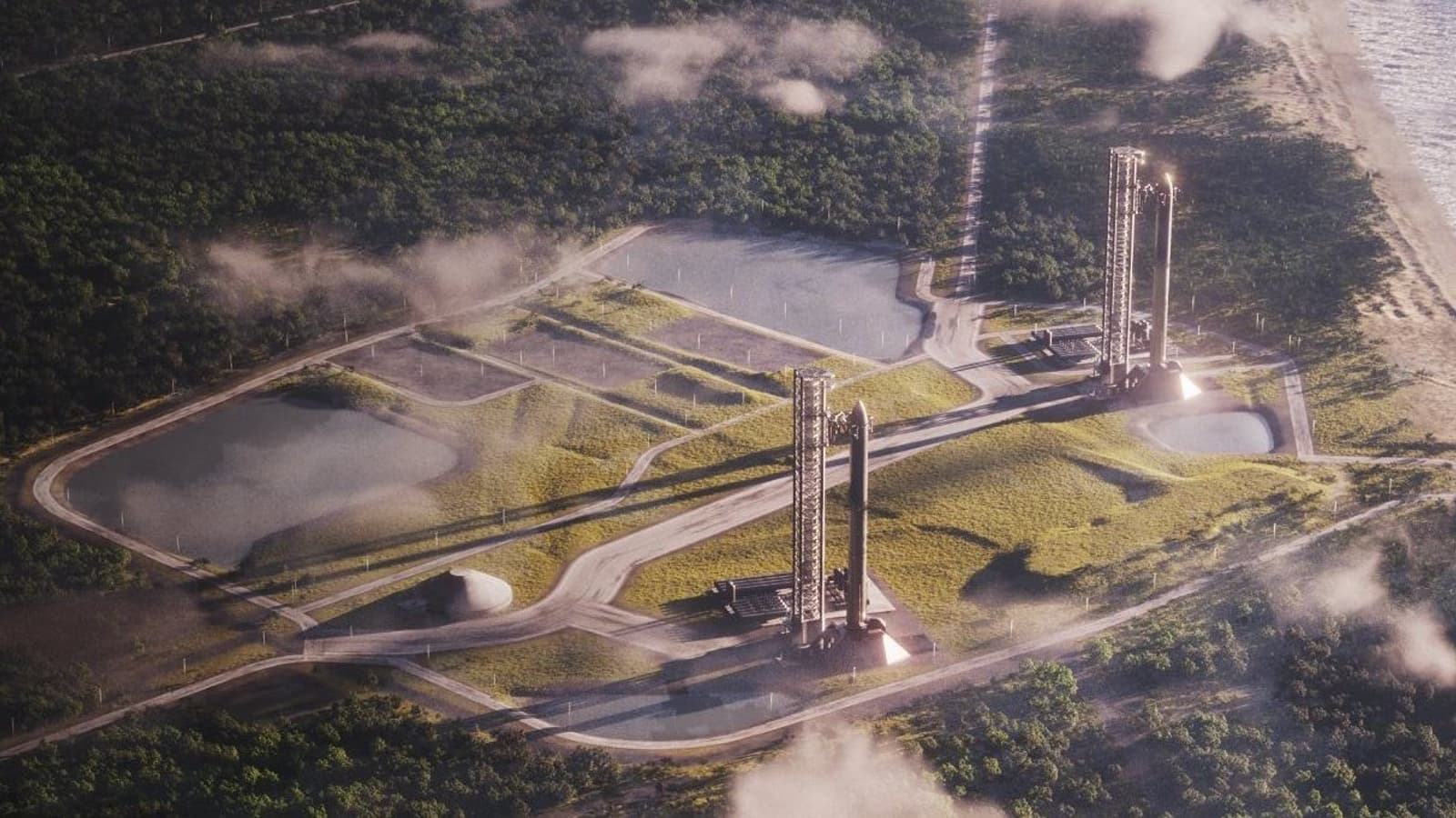 Особое внимание привлёк новый рендер стартового комплекса для ракеты Starship на мысе Канаверал, который в данный момент находится в стадии строительства.