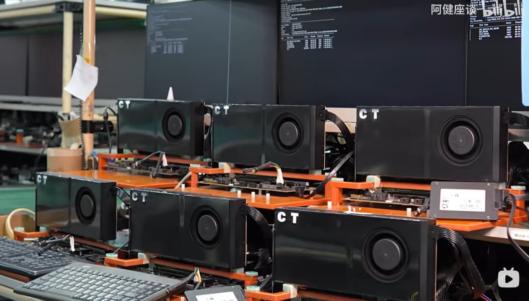 В Сеть попало видео, снятое в цеху китайской компании CT, которая массово переделывает RTX 5090 в профессиональные ускорители. Процесс непростой: GPU и чипы памяти выпаиваются с родной печатной платы и пересаживаются на специализированные платы, разработанные китайскими умельцами. Потом сверху монтируется специальная двухслотовая «турбина». Это позволяет сделать карты намного компактнее, чтобы была возможность размещать как можно больше адаптеров в одном корпусе.