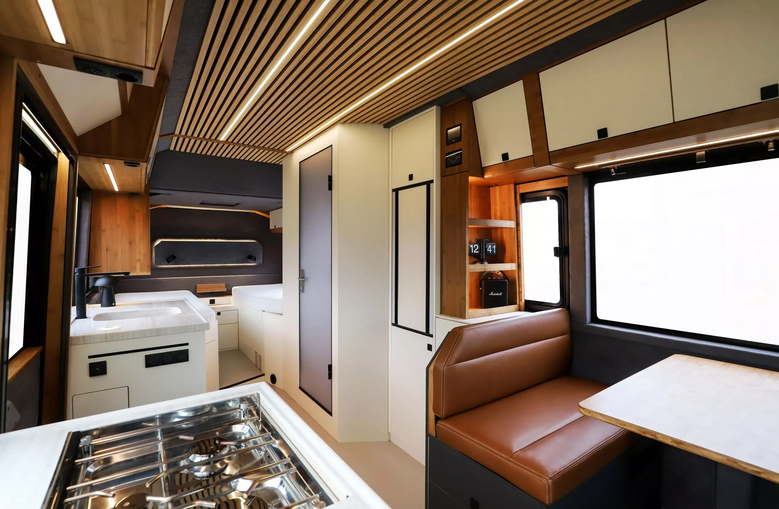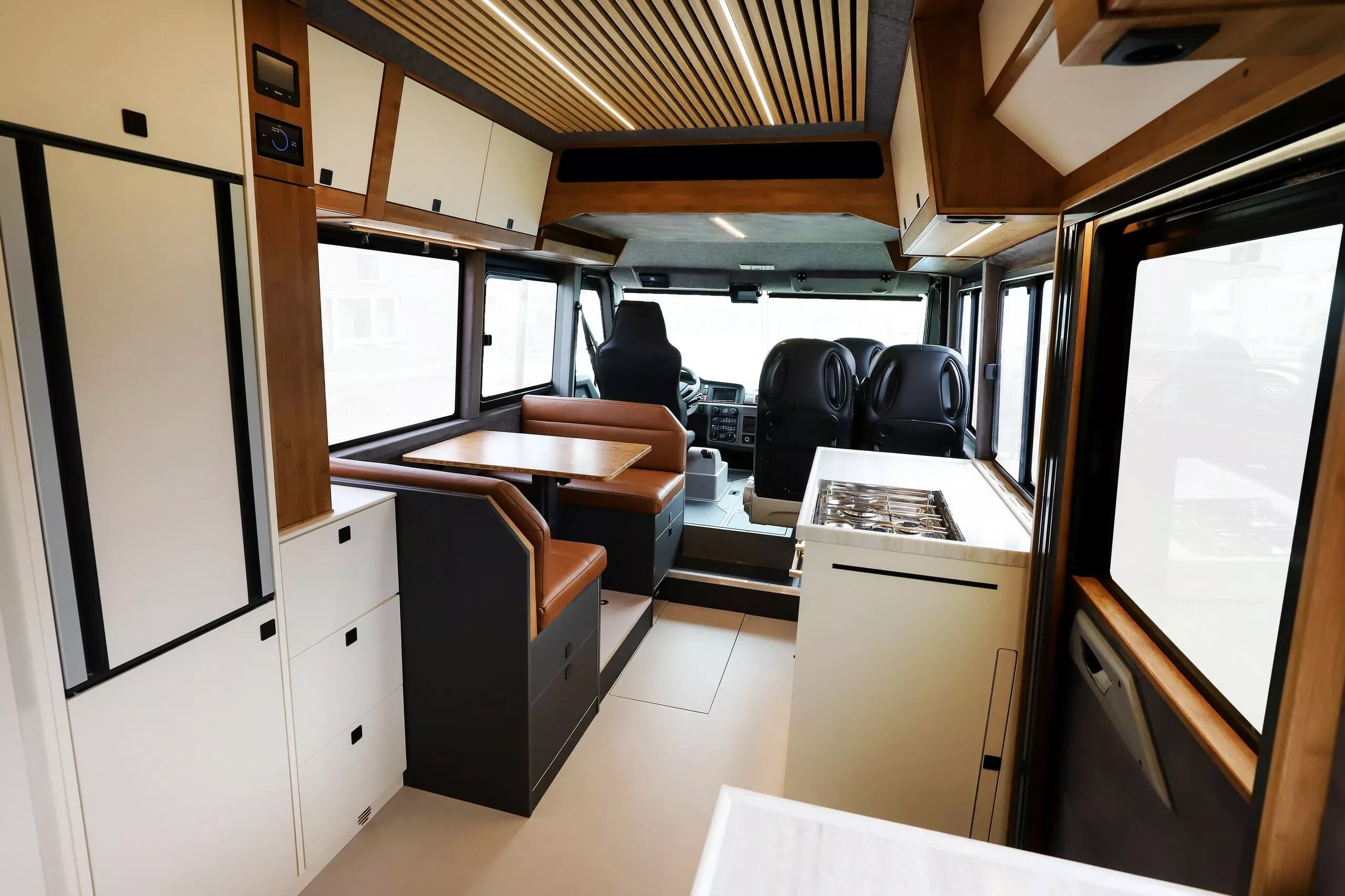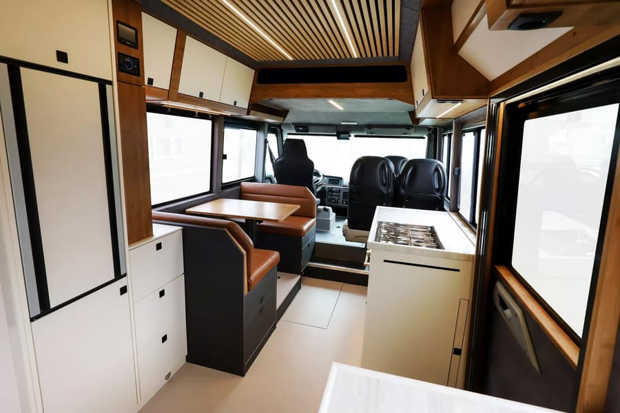 За сиденьями водителя и переднего пассажира расположены два дополнительных сиденья и просторная обеденная зона — с духовкой, плитой с четырьмя конфорками, большим холодильником, раковиной. В задней части находятся две односпальные кровати, которые можно трансформировать в двуспальную. Также имеется небольшая ванная комната с душем и туалетом.