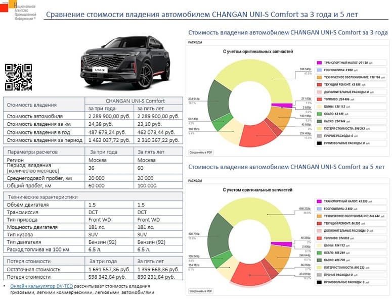 Аналитики НАПИ рассчитали стоимость владения кроссовером Changan Uni-S — за 5 лет она составит 2 310 367 рублей. При этом сама машина (расчет производился для комплектации Comfort) стоит 2 289 900 рублей.