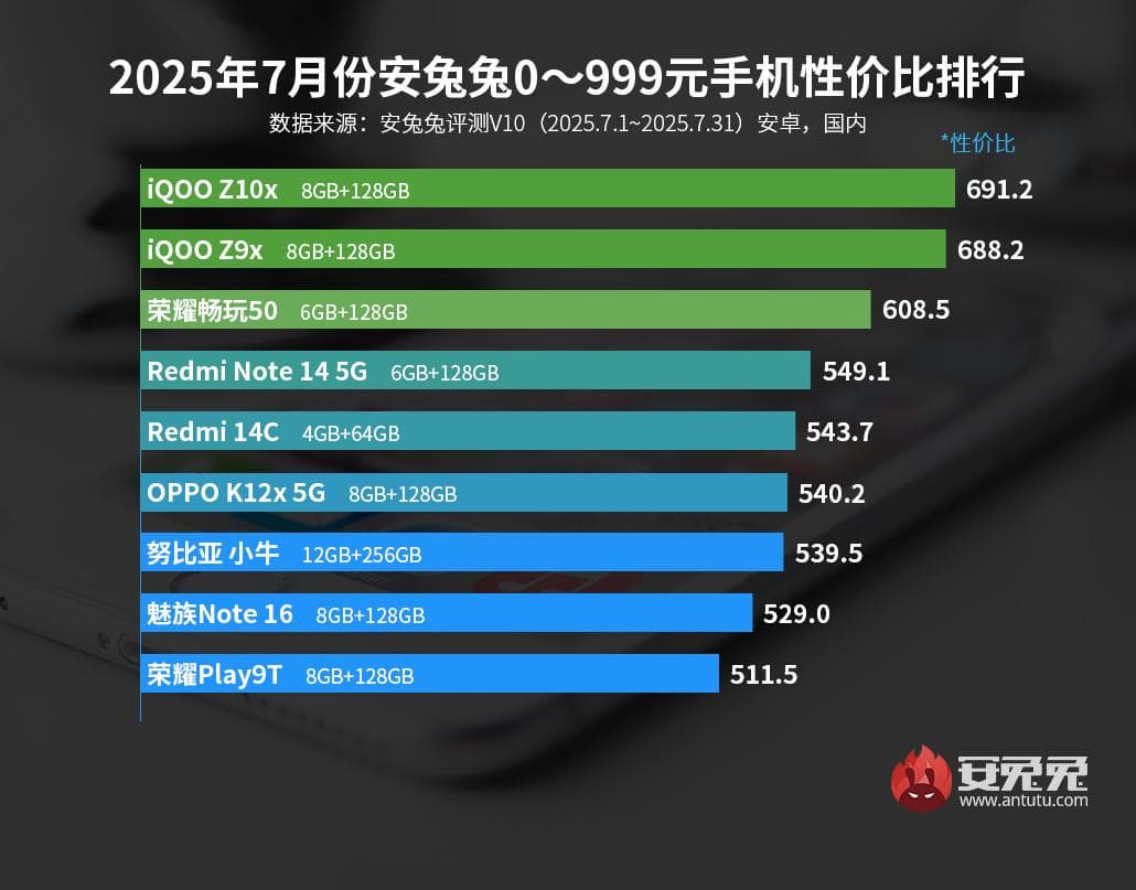 Разработчики AnTuTu опубликовали рейтинг самых мощных смартфонов из числа самых доступных моделей — ценой от 0 до 1000 юаней (до 140 долларов или примерно 11 тыс. рублей). Возглавил рейтинг iQOO Z10x в конфигурации 8/128 ГБ за 944 юаня (130 долларов или 10,5 тыс. рублей). Эта модель построена на платформе MediaTek Dimensity 7300-Ultra.