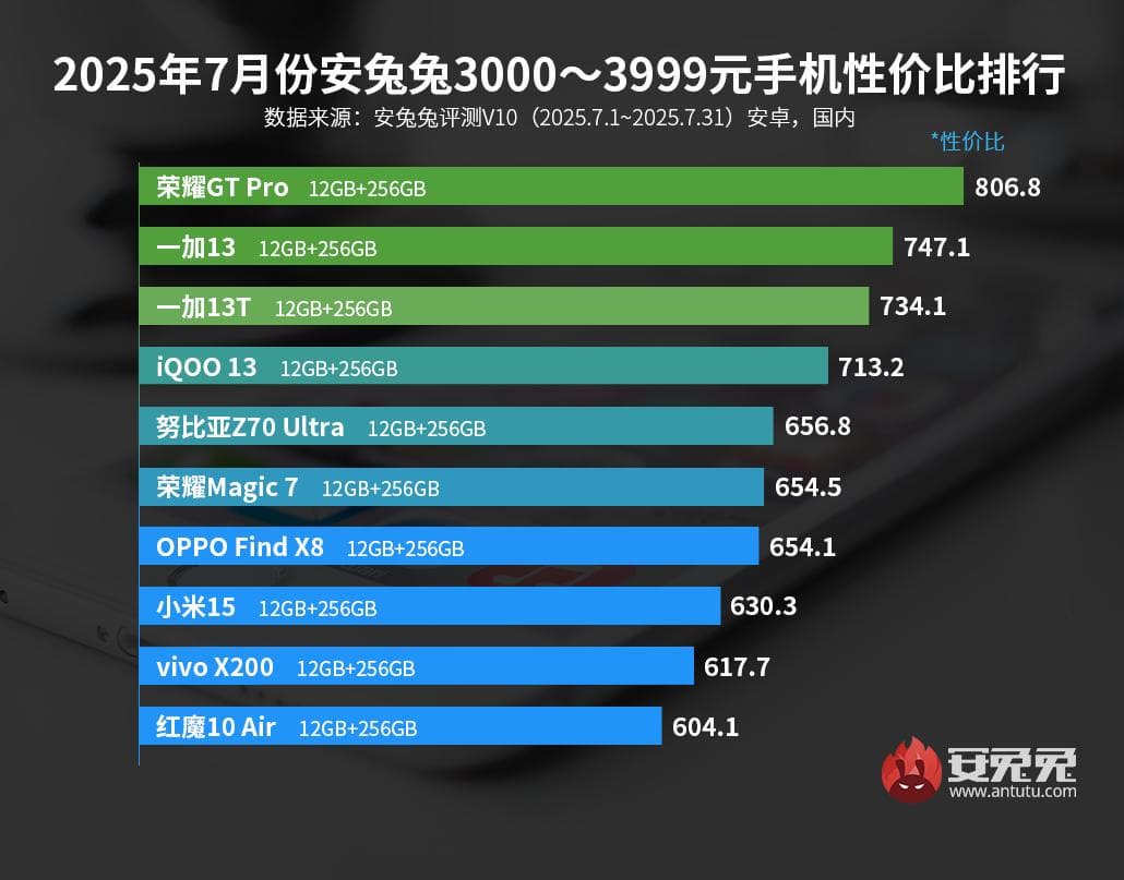 В AnTuTu назвали не только самые мощные смартфоны из дешевых, но и самые мощные флагманы в ценовой нише от 3 тыс. до 4 тыс. юаней (от 420 до 560 долларов). Это очень насыщенный сегмент, а лидером в нем стал Honor GT Pro в конфигурации 12/256 ГБ и на базе разогнанной версии Qualcomm Snapdragon 8 Elite Leadership Edition.