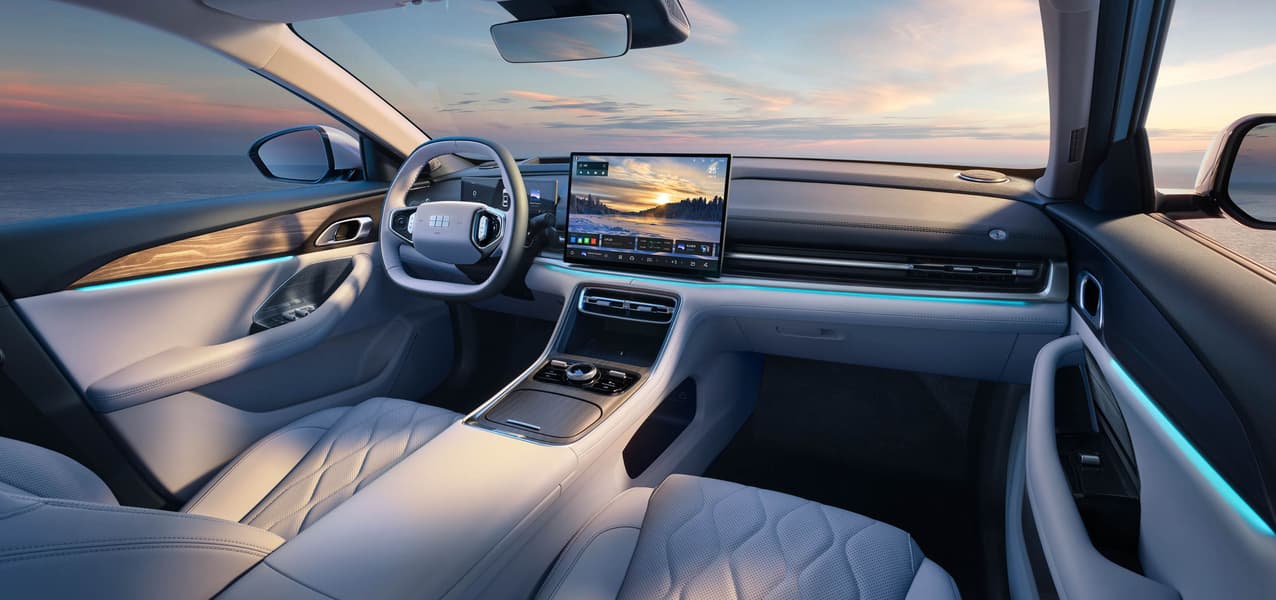 В салоне — панорамная крыша площадью 0,87 м2, двухспицевое многофункциональное рулевое колесо, медиасистема с экраном диагональю 14,6 или 15,4 дюйма, передние кресла с подогревом, вентиляцией и массажем.