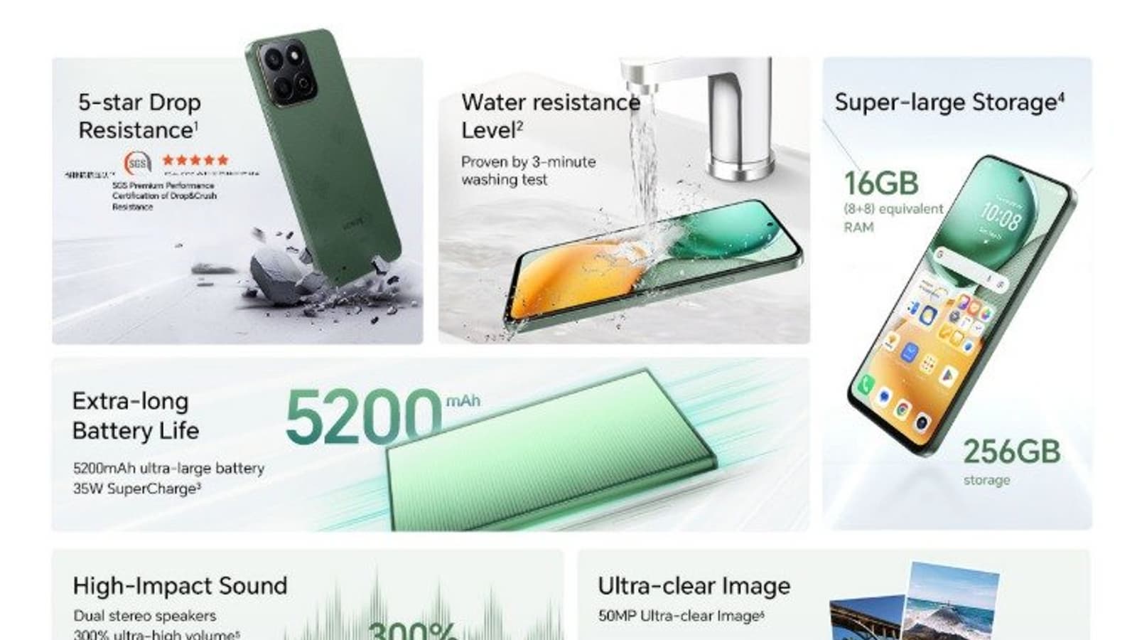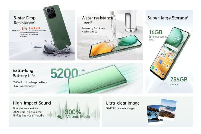 Honor оснастила устройство 16 ГБ оперативной памяти (8 ГБ физической + 8 ГБ виртуальной) и 256 ГБ встроенной флеш-памяти. Аккумулятор ёмкостью 5200 мА·ч с быстрой зарядкой 35 Вт гарантирует длительное время работы. X7c обладает защитой от пыли и воды IP64. Среди других особенностей — два очень громких стереодинамика, режим максимального энергосбережения и такие функции, как ИИ-шумоподавление при звонках.