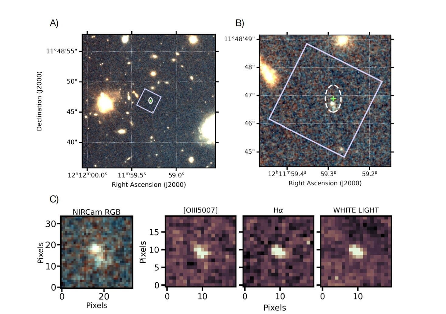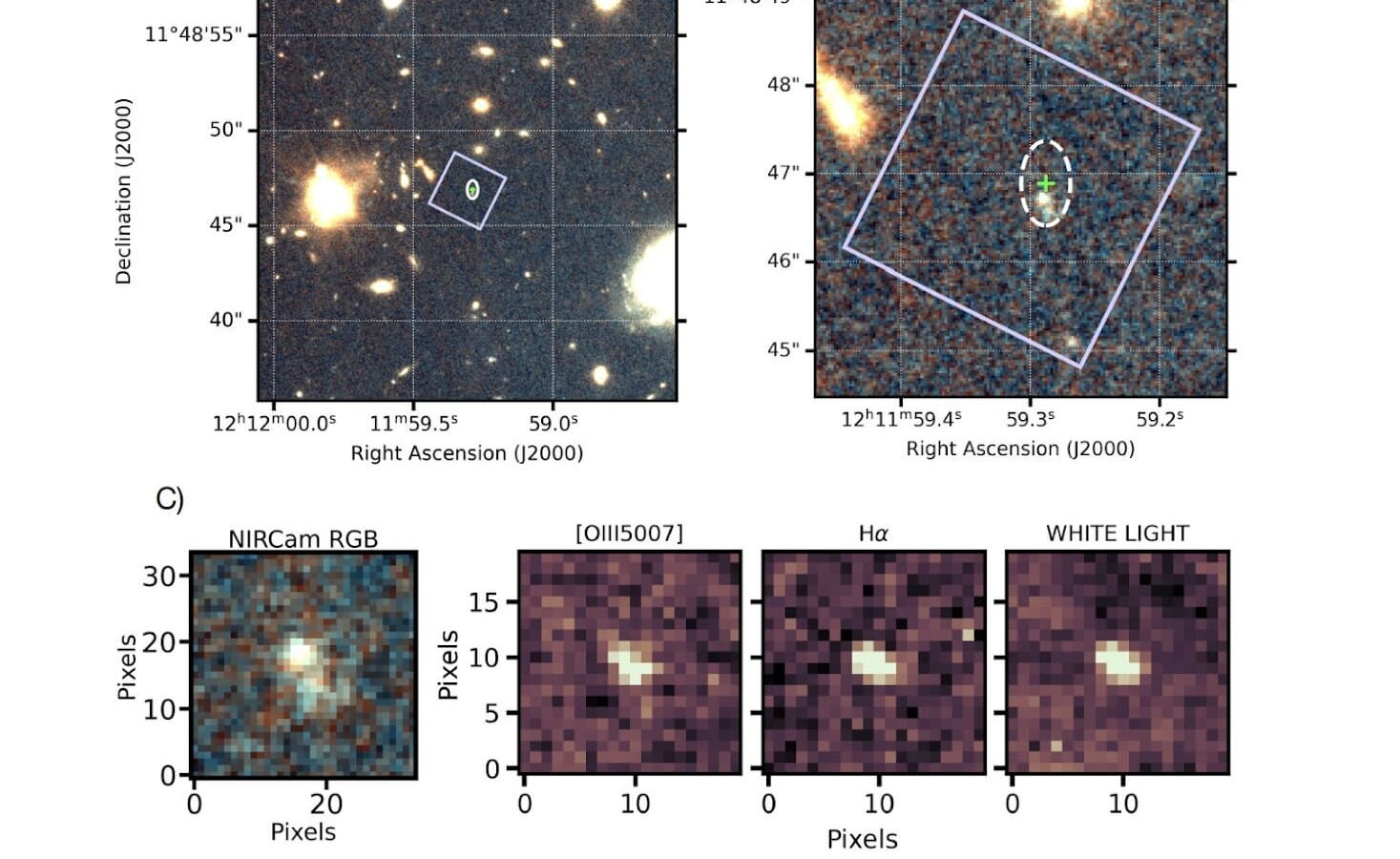 Чтобы уточнить, где именно произошёл всплеск, команда использовала космический телескоп «Джеймс Уэбб». Камера NIRCam выявила крошечную, слабо светящуюся галактику, а спектрограф NIRSpec позволил измерить её красное смещение: z = 2,148 ± 0,001. Это в два раза дальше, чем у предыдущих точно локализованных FRB, и соответствует эпохе, когда темп звездообразования во Вселенной был максимальным.