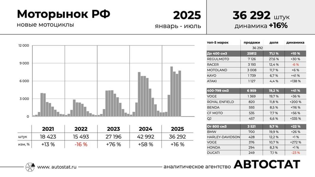 В период с января по июль 2025 года в России было зарегистрировано 36,3 тыс. мотоциклов, что на 16% больше, чем за аналогичный период прошлого года.