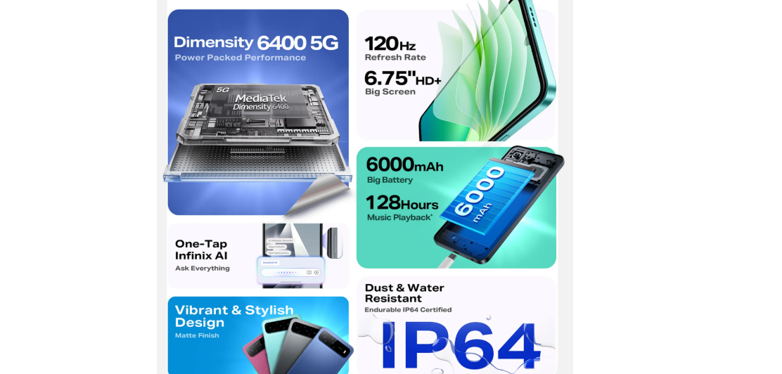 Infinix Hot 60i 5G работает на базе чипсета Dimensity 6400, дополненного 4 ГБ оперативной памяти, 4 ГБ виртуальной памяти и 128 ГБ встроенной флеш-памяти. Устройство оснащено аккумулятором ёмкостью 6000 мА·ч с поддержкой обратной зарядки. Смартфон может воспроизводить музыку 128 часов или более пяти суток.