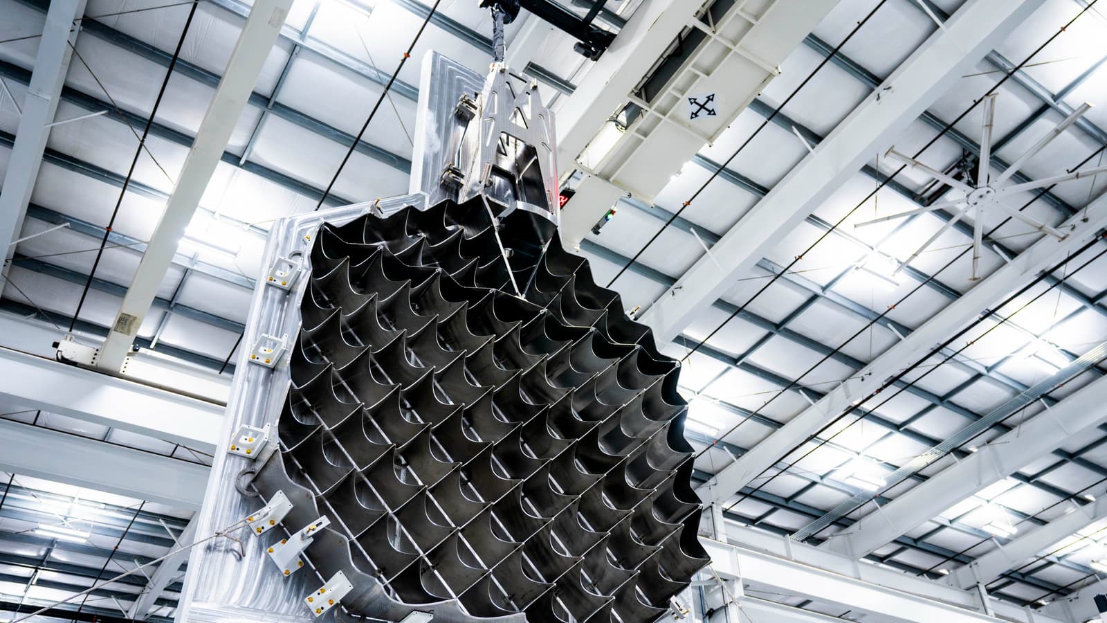 «Первый решётчатый руль для сверхтяжёлого ускорителя нового поколения. Усовершенствованные решётчатые рули увеличены на 50% и стали прочнее: вместо четырёх стало три, что улучшает управляемость и позволяет ускорителю снижаться под большими углами атаки», — сообщила SpaceX.