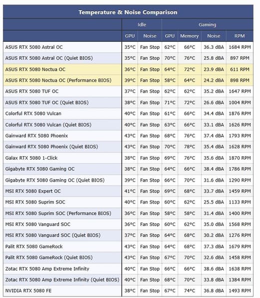 Asus ROG Astral в режиме Quiet может приблизиться к этому показателю со своими 25,8 дБА и 897 об/мин, но при этом температура GPU в этом случае достигает 70 градусов, а у Noctua - 58 либо 64 градуса в зависимости от режима. То есть это однозначно самая тихая карта, и также самая тихая в пересчёте на температуру GPU. Только модель MSI Suprim в режиме Performance может обеспечить те же 58 градусов, только при уровне шума в 31,4 дБА.