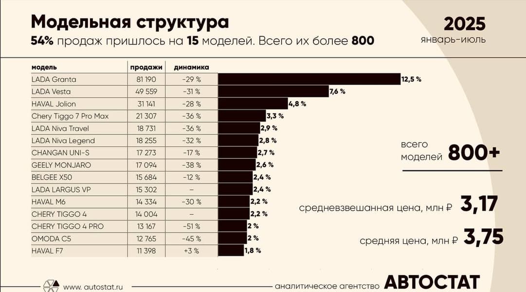 Российский авторынок демонстрирует удивительную концентрацию: по данным «Автостата», всего 15 моделей (2% от общего числа) обеспечивают более половины (54%) всех продаж новых легковых автомобилей в стране.