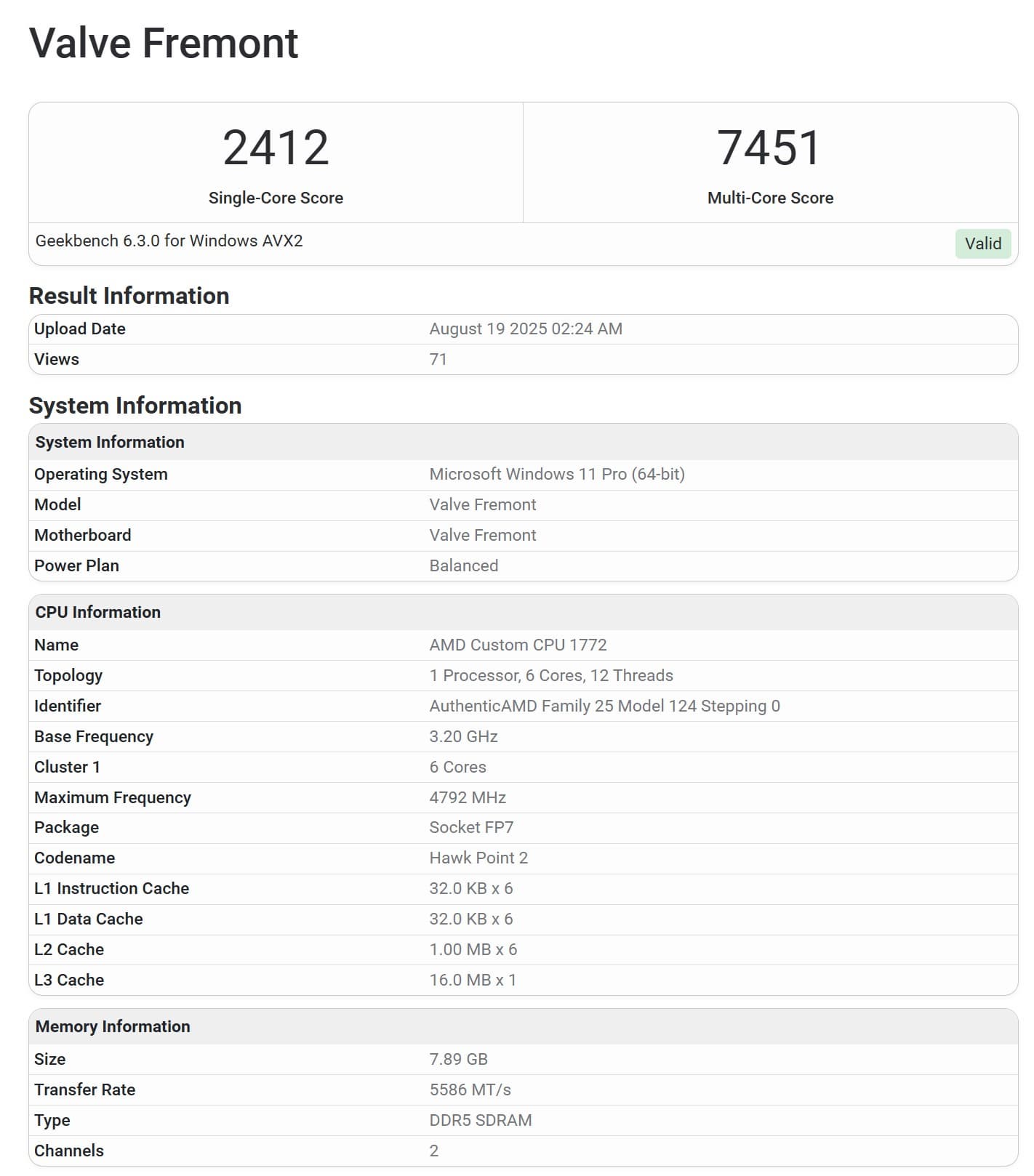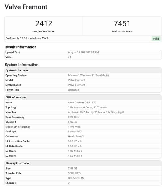 Устройство под кодовым именем Valve Fremont оснащено каким-то полузаказным процессором AMD с шестью ядрами Zen 4 и 16 МБ кеш-памяти третьего уровня. У тестового образца частота работы достигала 4,8 ГГц. То есть это что-то похожее на линейку Hawk Point (Ryzen 8040).