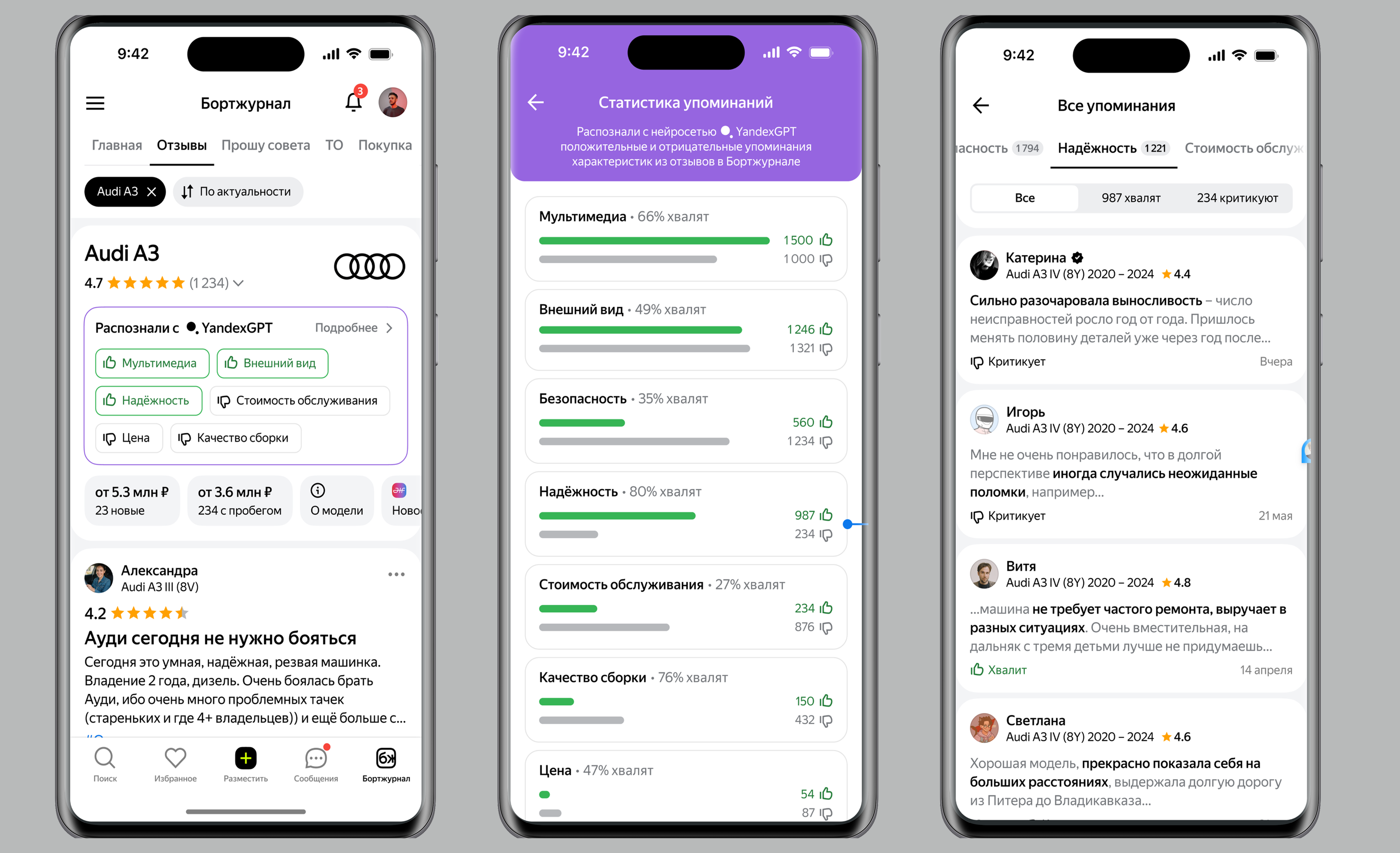 Сервис с помощью YandexGPT анализирует мнения водителей по 17 ключевым аспектам: от внешнего вида, шумоизоляции и работы мультимедиа до расхода топлива, качества сборки, динамики, обзорности, стоимости обслуживания и надёжности.