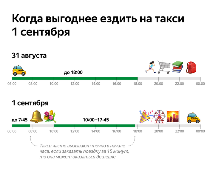 В День знаний, который в этом году выпадает на понедельник, пик заказов ожидается в районе 7-9 утра и продержится до 10:00 — к началу линеек, после чего спрос стабилизируется. Количество желающих поехать на такси в среднем увеличится на 11% по сравнению с началом предыдущей недели. В зависимости от района и времени поездок может стать больше на 20-25%.