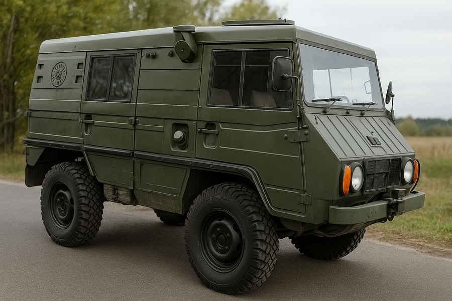 Pinzgauer — легендарный армейский внедорожник, созданный в Австрии компанией Steyr-Puch. Версия 710К представляет собой командирский вариант: у машины портальные мосты, 2,5-литровый бензиновый мотор мощностью 92 л.с., механическая коробка передач и полный привод. Владелец машины отмечает, что для управления Pinzgauer достаточно водительского удостоверения категории «B», так как по документам он числится как легковой автомобиль.