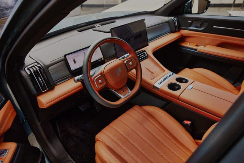Интерьер оснащён ЖК-панелью, 15,6-дюймовым экраном, чипом Qualcomm Snapdragon 8155 и операционной системой TOUR OS 3.0 с голосовым помощником Doubao AI от ByteDance. Среди особенностей — беспроводная зарядка на 50 Вт, аудиосистема с 12 динамиками, 43 отсека для хранения и багажник объёмом до 1708 литров.