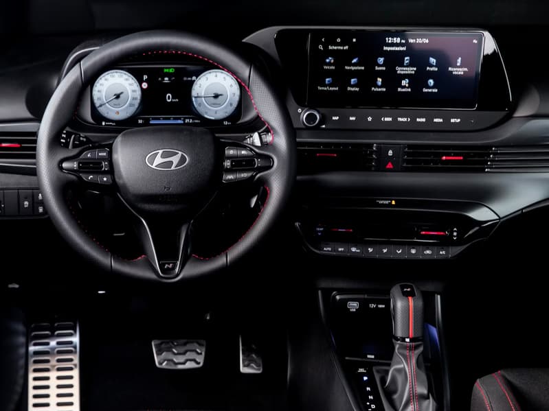 В салоне — спортивные сиденья, руль с красной прострочкой и металлические накладки на педали. Панель приборов цифровая, есть медиасистема с 10-дюймовым экраном и атмосферная подсветка.